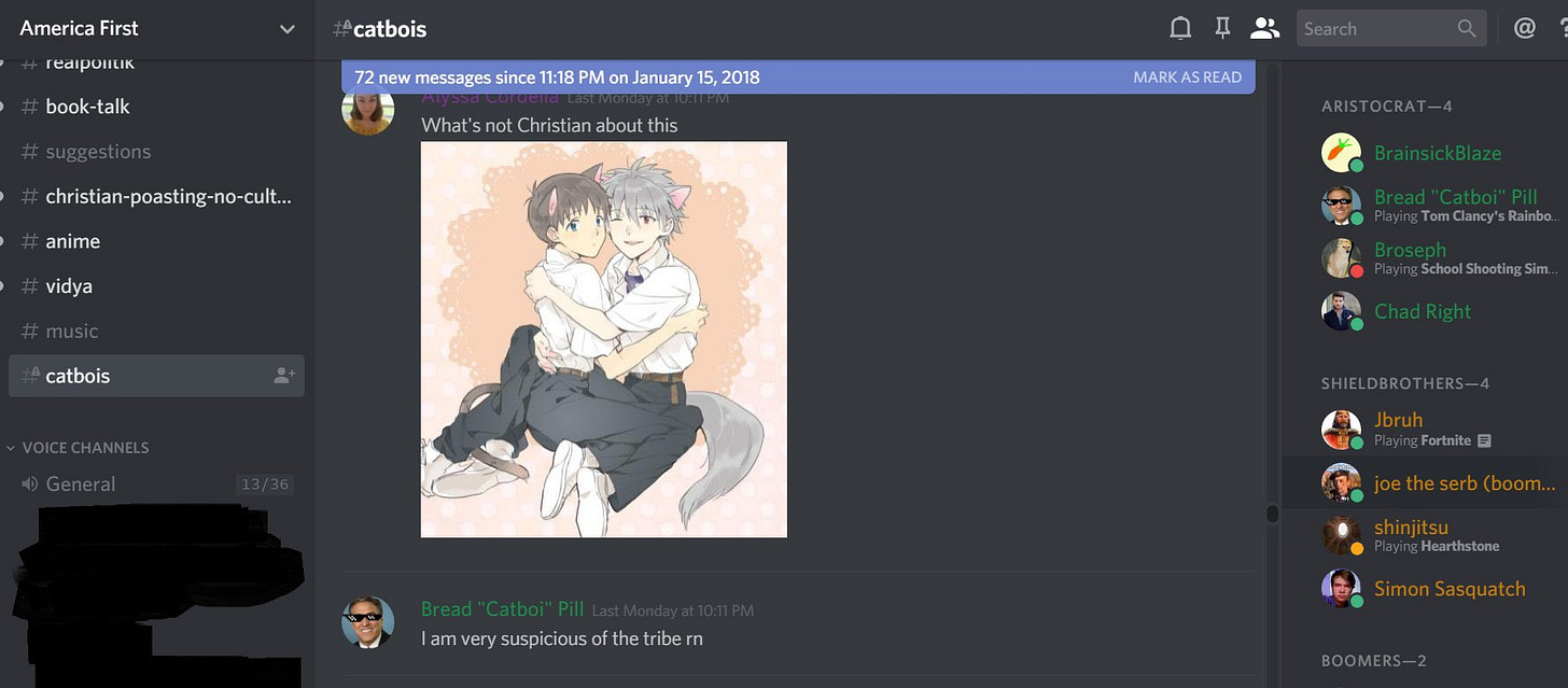 At an initial level this seems most directly related to the question of Fuentes’s celibacy and lack of romantic experience or success with women. Note however the phrase “many theories about.” This alludes to a greater context of—if not scandals—liabilities and embarrassments about Fuentes that have been documented in certain, undisclosed corners of the Internet. These matters further impugn Fuentes and implore caution that he is at best a long-term liability to any meaningful opposition to the left. First and foremost among these scandals is that Fuentes was caught having a browser window featuring tranny catboy pornography. This was followed by another incident in 2024 where a gay pornographic stream came on one venue, but not others, lending some credence to the hacking theory in that particular instance. He has also been associated with a particularly odious twink known as “Catboy Kami.” Consider also embarrassing rants like this video, insisting that gay sex is (somehow) not really sex. Another scandal of note concerns Fuentes being linked to a discord server in 2018 that included a “Catbois” channel featuring sexualized animations of underage boys. This vile genre is known as shotacon.