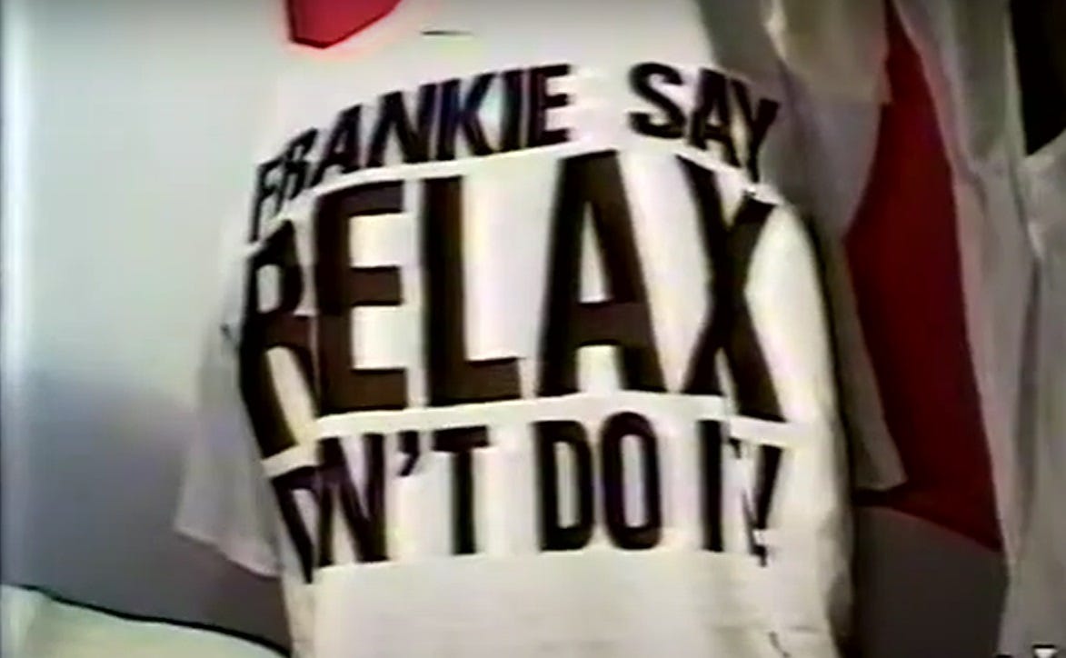 A still shot from a BBC news production on the Frankie Say craze that overtook the Anglosphere in 1985 shortly after the limp-wristed “ban.” Broadcasting that something is banned without actually banning only increases its notoriety and popularity.