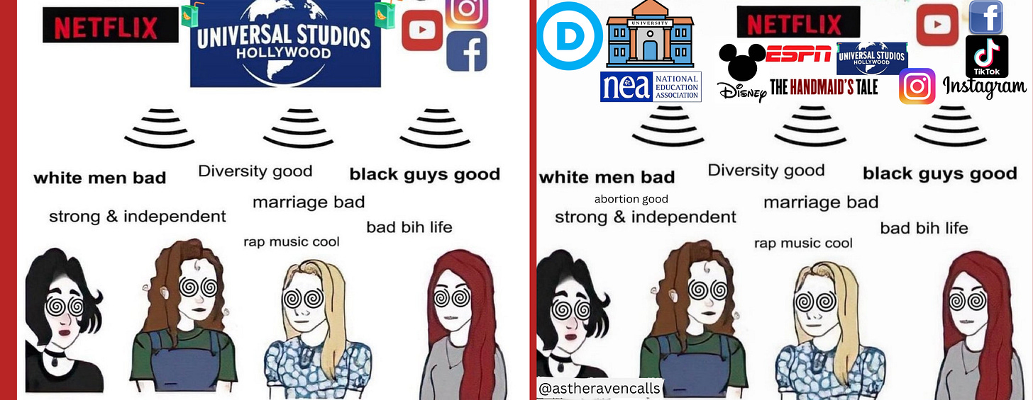 Before and after: on the left an insightful meme illustrating precisely how disconcerting cultural trends are disseminated by powerful interests. On the right, improvements made by this author.